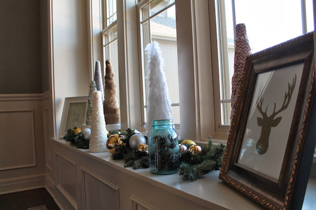 This is our entry way table. I only added a few extra pieces here. I bought the gold trees, silver pine cones, snowman, reindeer, wreath and cake stand at Hobby Lobby. Can you guess how much I love Hobby Lobby? The Christmas tree printable is also from Pinterest and you can find the link here.